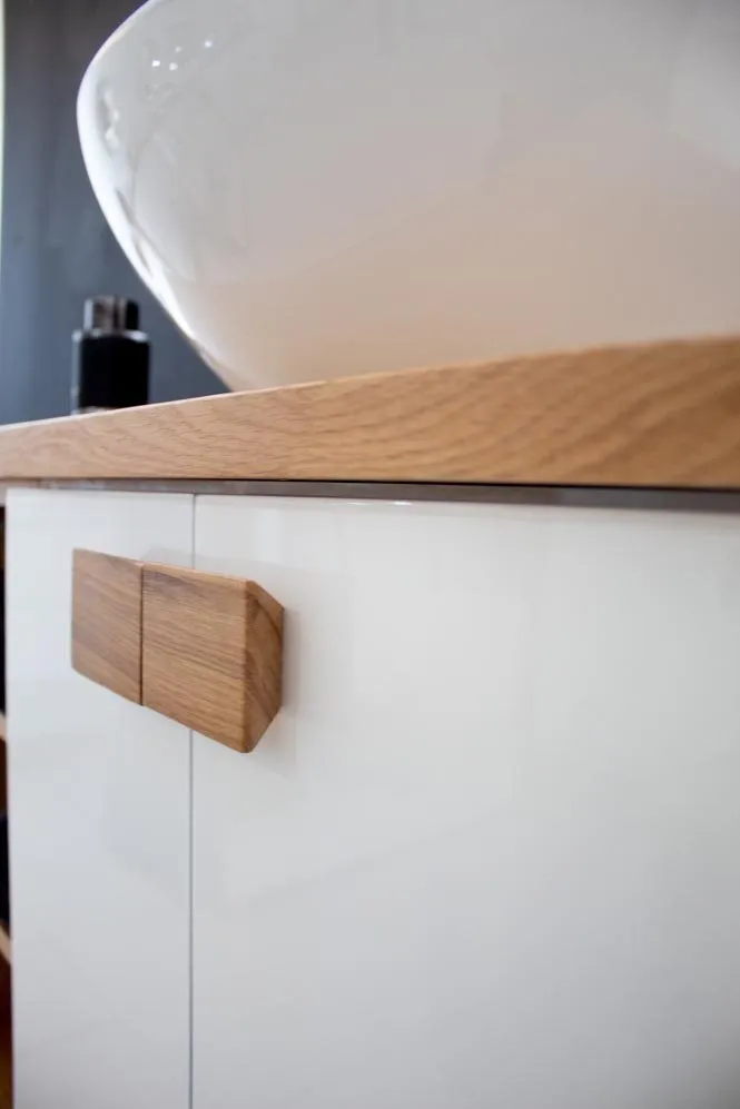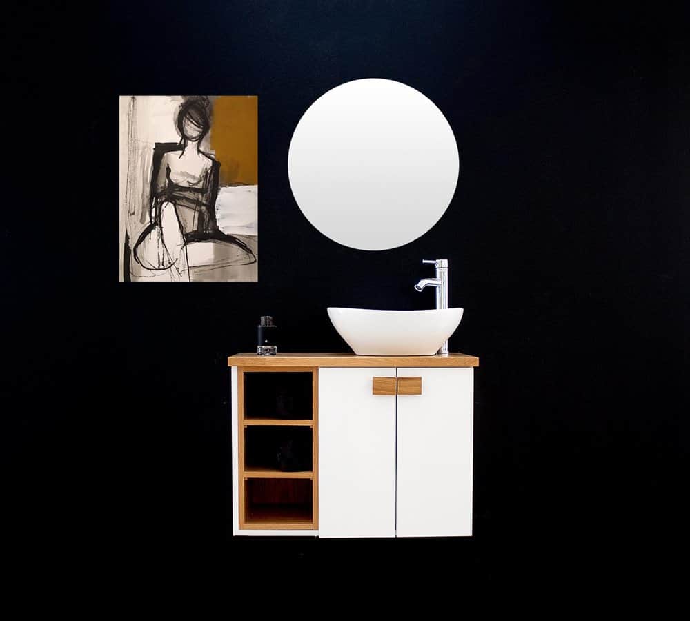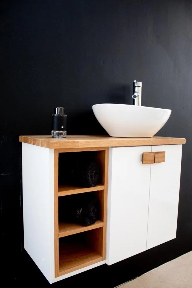 ארון אמבטיה תלוי רוחב 70 ס"מ בעומק 33 ס"מ צבע לבן מבריק עם משטח עץ מלא להנחת כיור מונח דגם אוקלנד 70