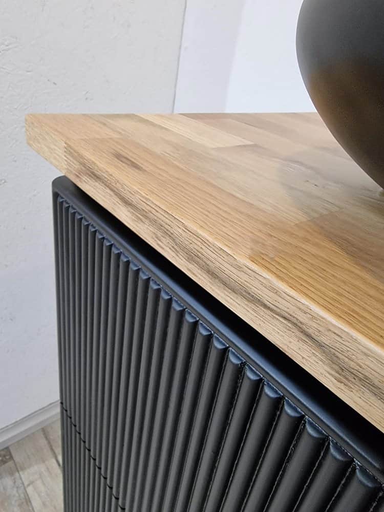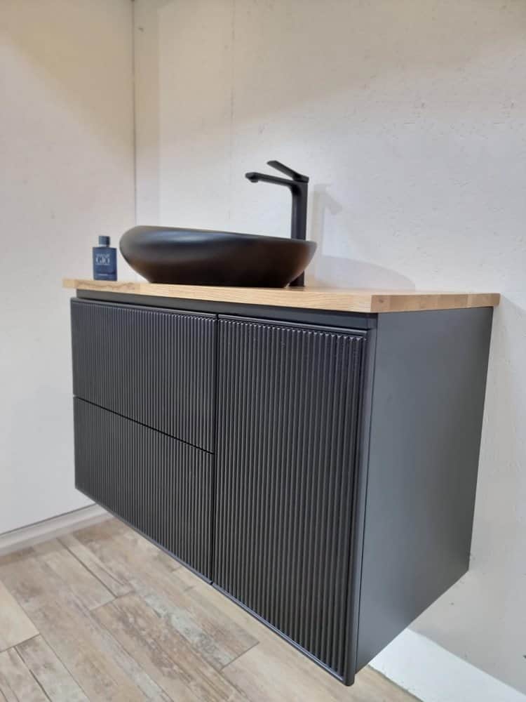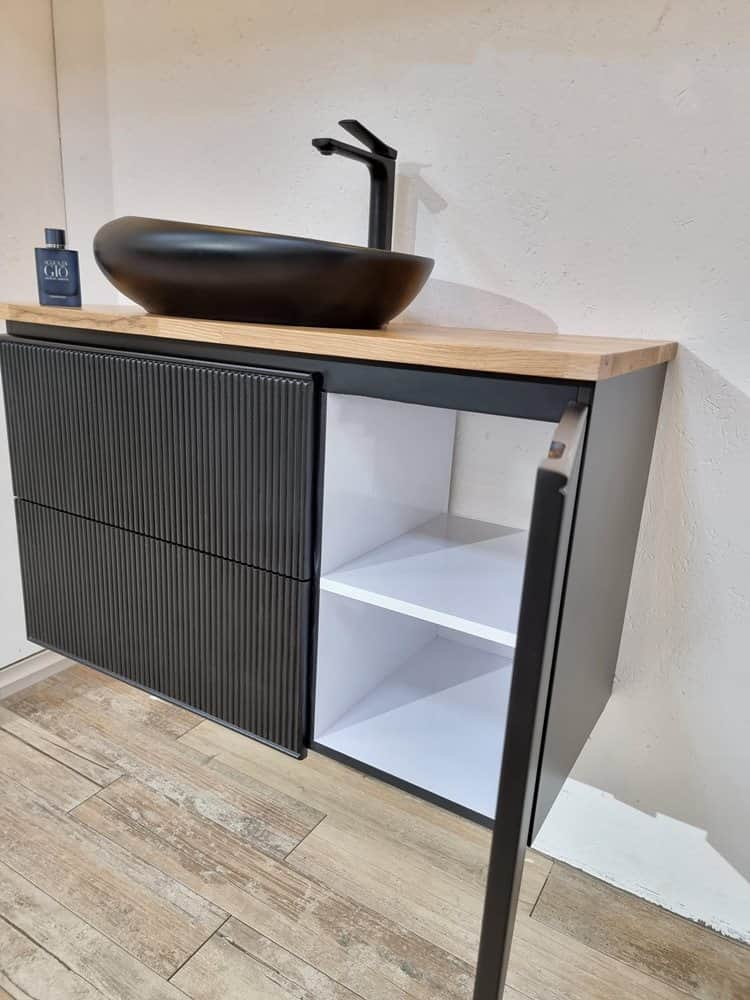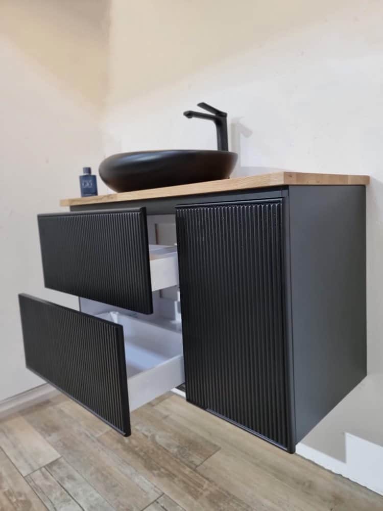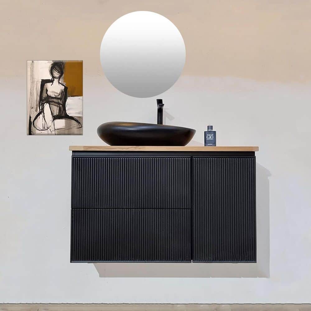 ארון אמבטיה תלוי רוחב 100 ס"מ בעומק 46 ס"מ צבע שחור מט עם משטח עץ מלא להנחת כיור מונח דגם תאימז 100