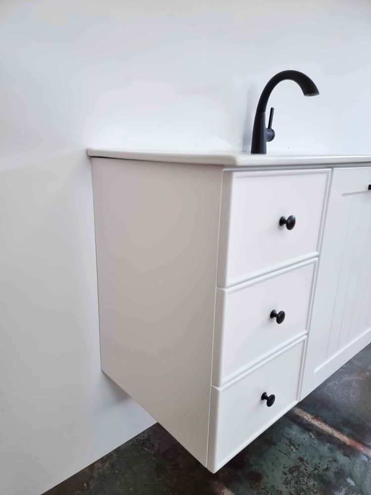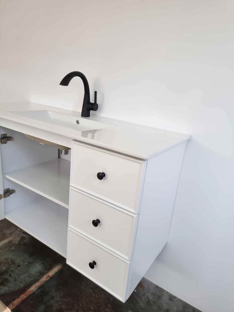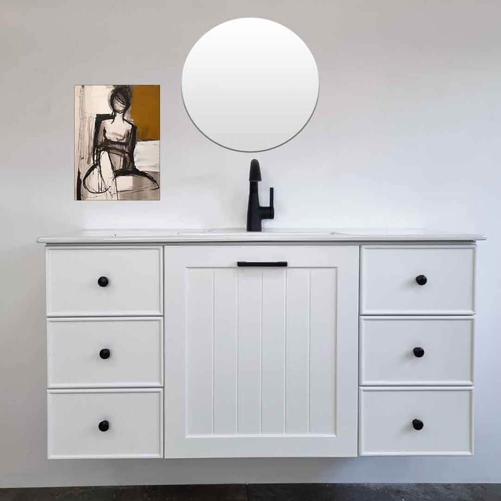 ארון אמבטיה תלוי רוחב 120 ס"מ בעומק 46 ס"מ צבע לבן מט עם כיור משטח חרס שקוע דגם צרפת 120