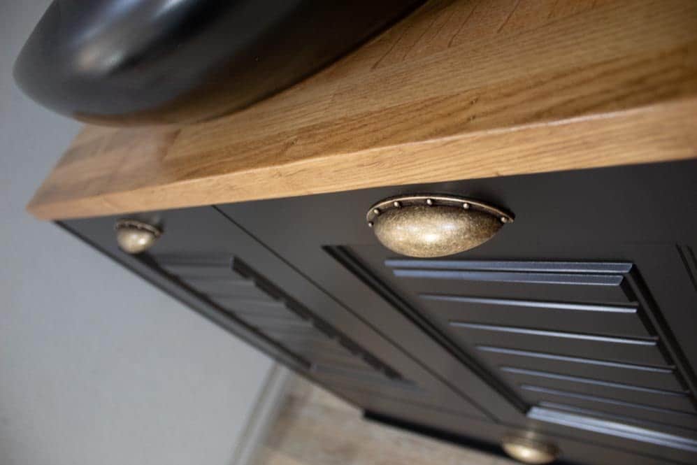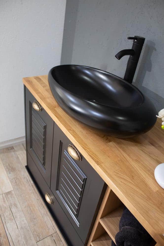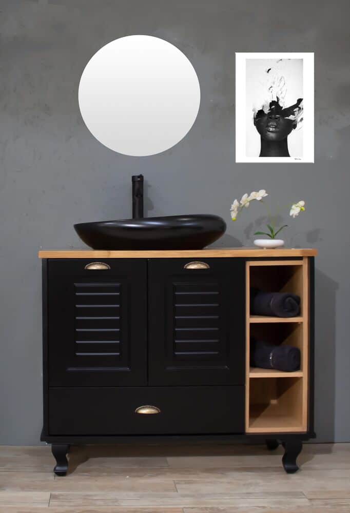 ארון אמבטיה עומד רוחב 80 ס"מ בעומק 46 ס"מ צבע שחור מט עם משטח עץ מלא להנחת כיור מונח דגם ספיישל 80