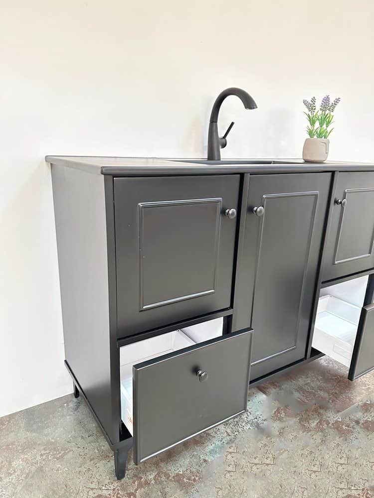 ארון אמבטיה עומד רוחב 120 ס"מ בעומק 46 ס"מ צבע שחור מט עם משטח עץ מלא להנחת כיור מונח דגם האגי 120