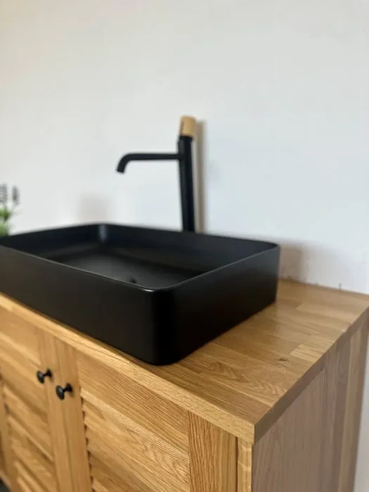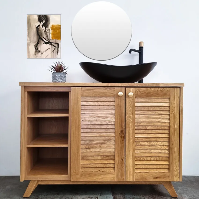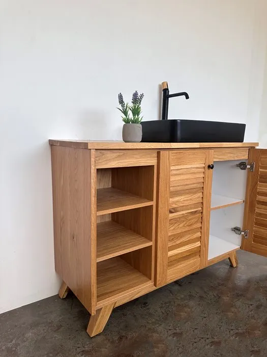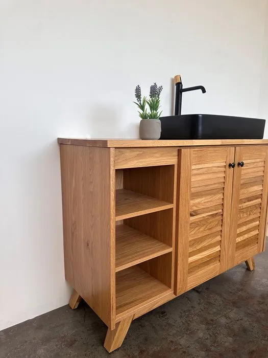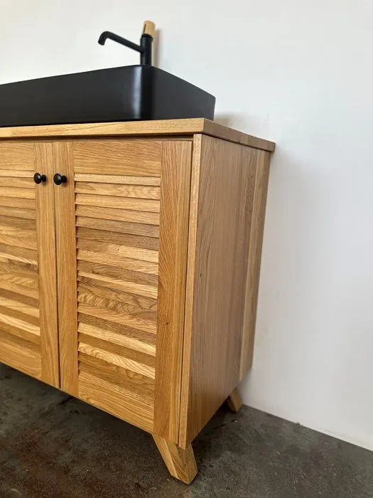 ארון אמבטיה עומד רוחב 120 ס"מ בעומק 46 ס"מ עשוי מעץ מלא אלון מבוקע עם משטח להנחת כיור מונח דגם סנטה 120