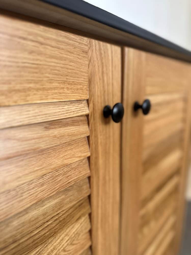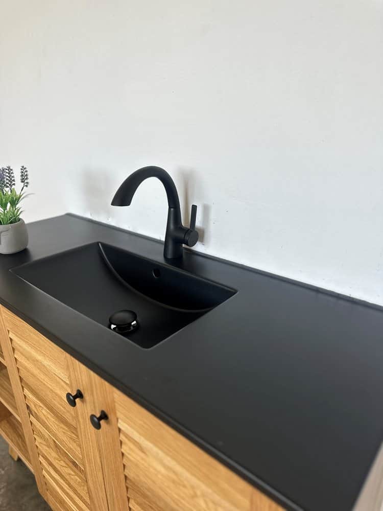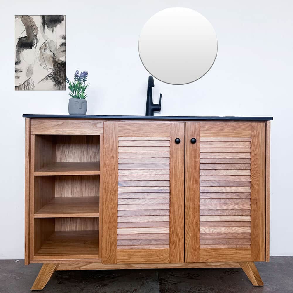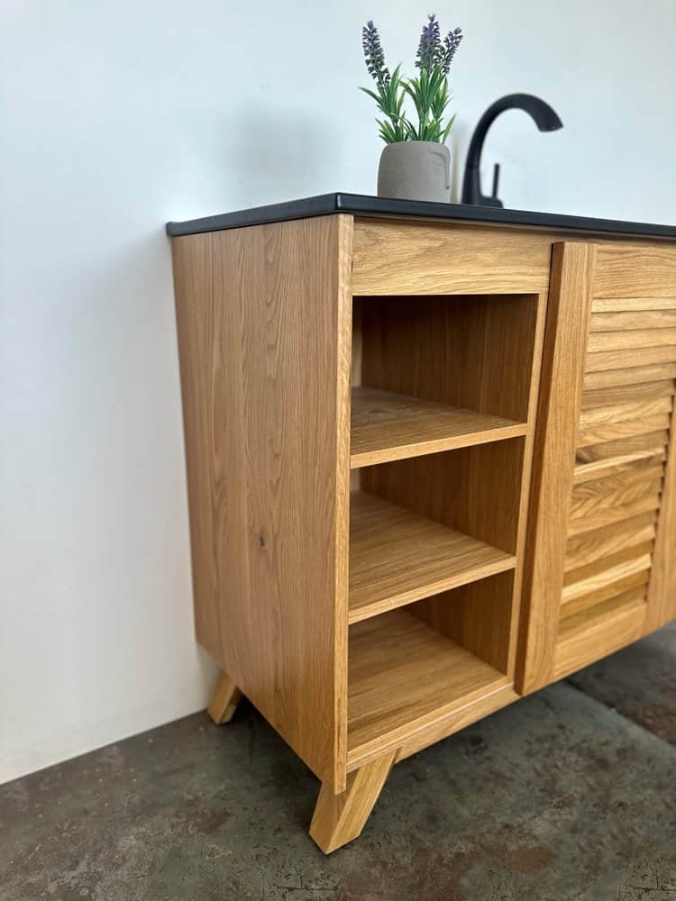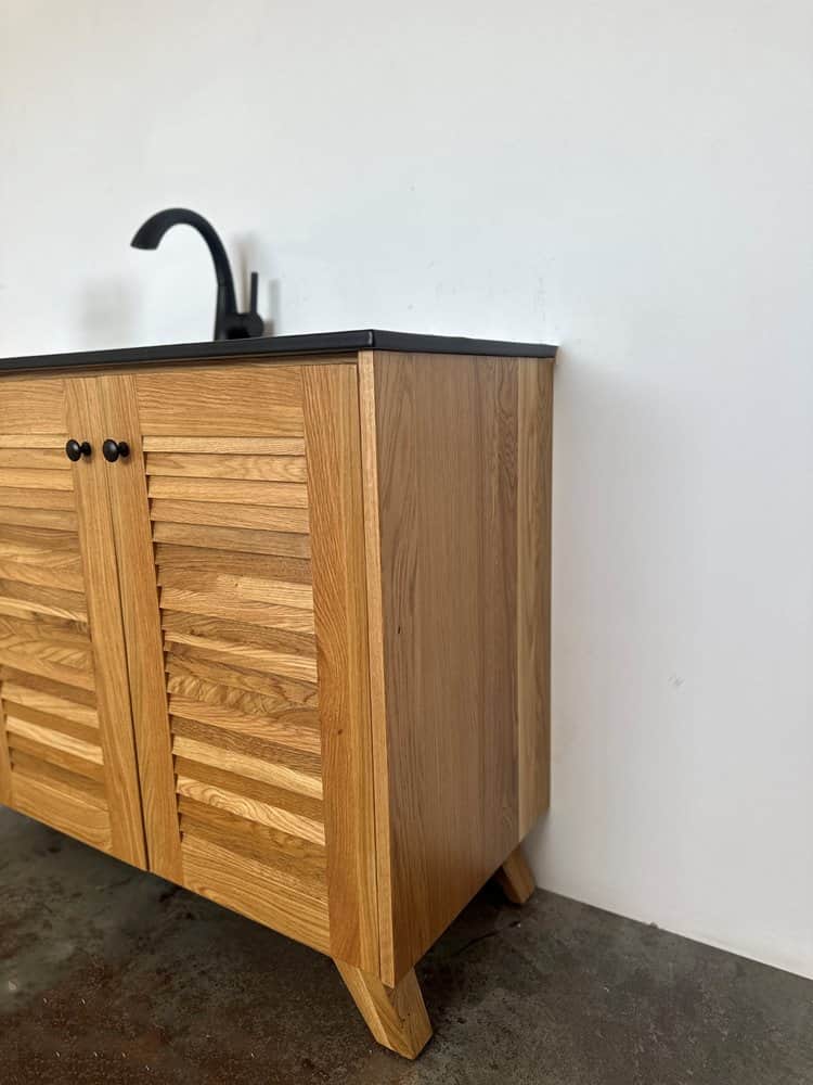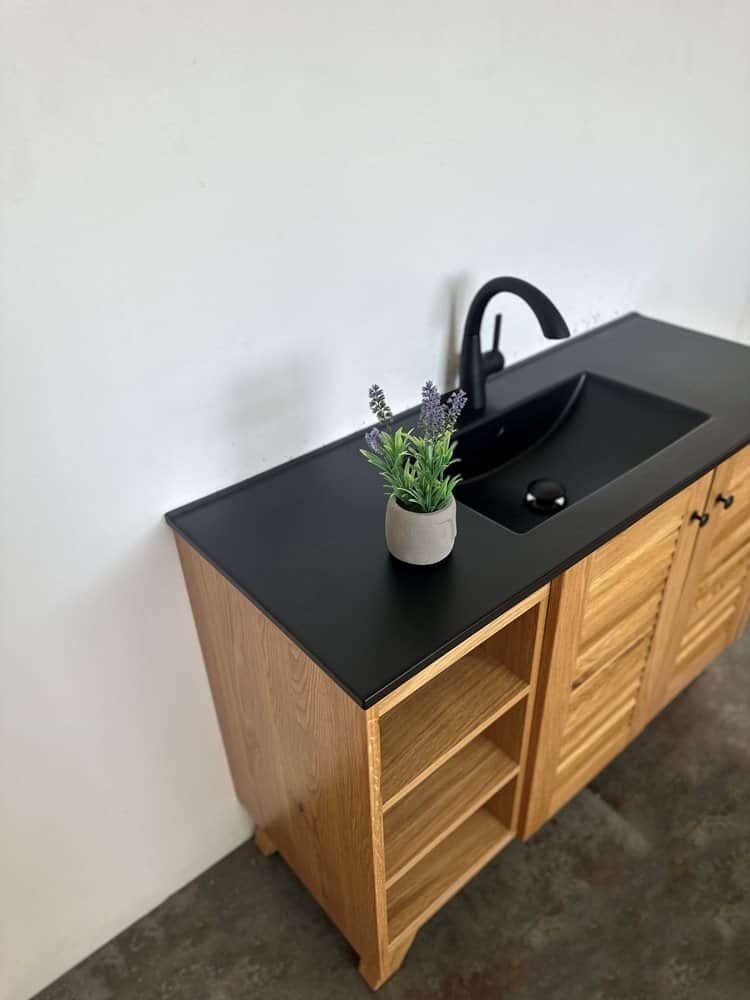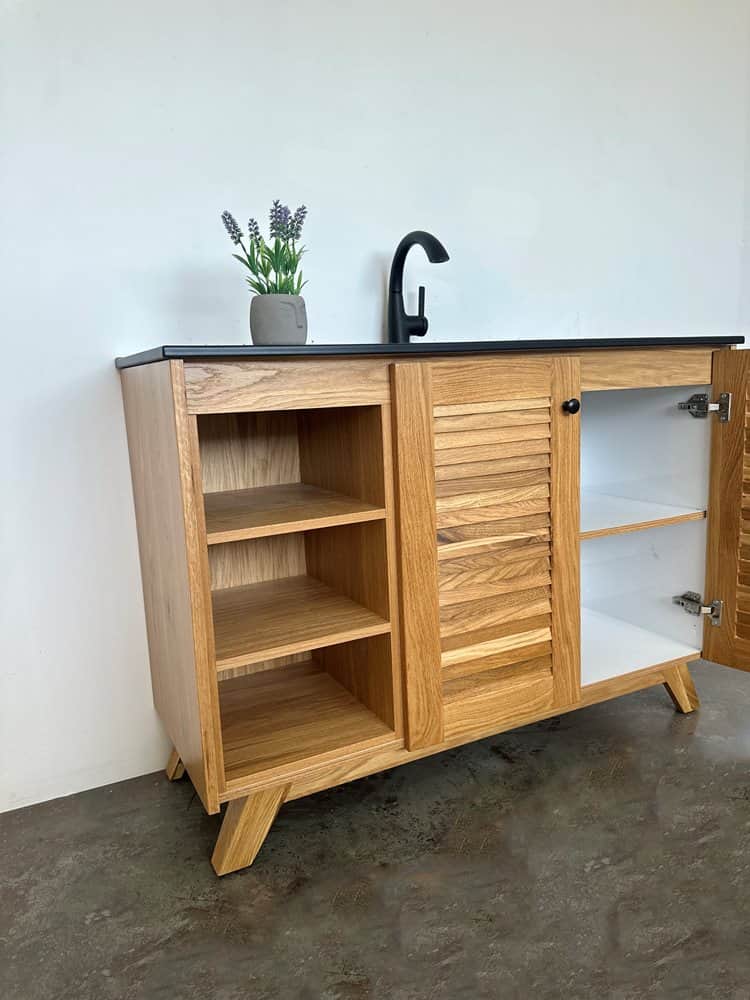 ארון אמבטיה עומד רוחב 120 ס"מ בעומק 46 ס"מ עשוי מעץ מלא אלון מבוקע עם כיור משטח חרס שקוע דגם איסטנבול 120
