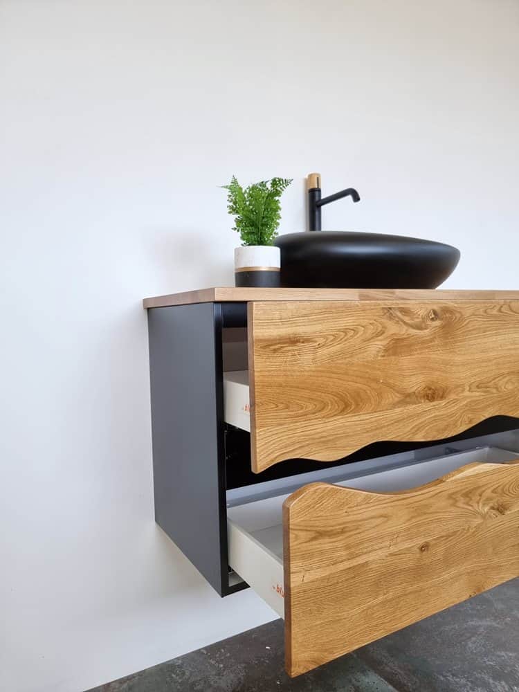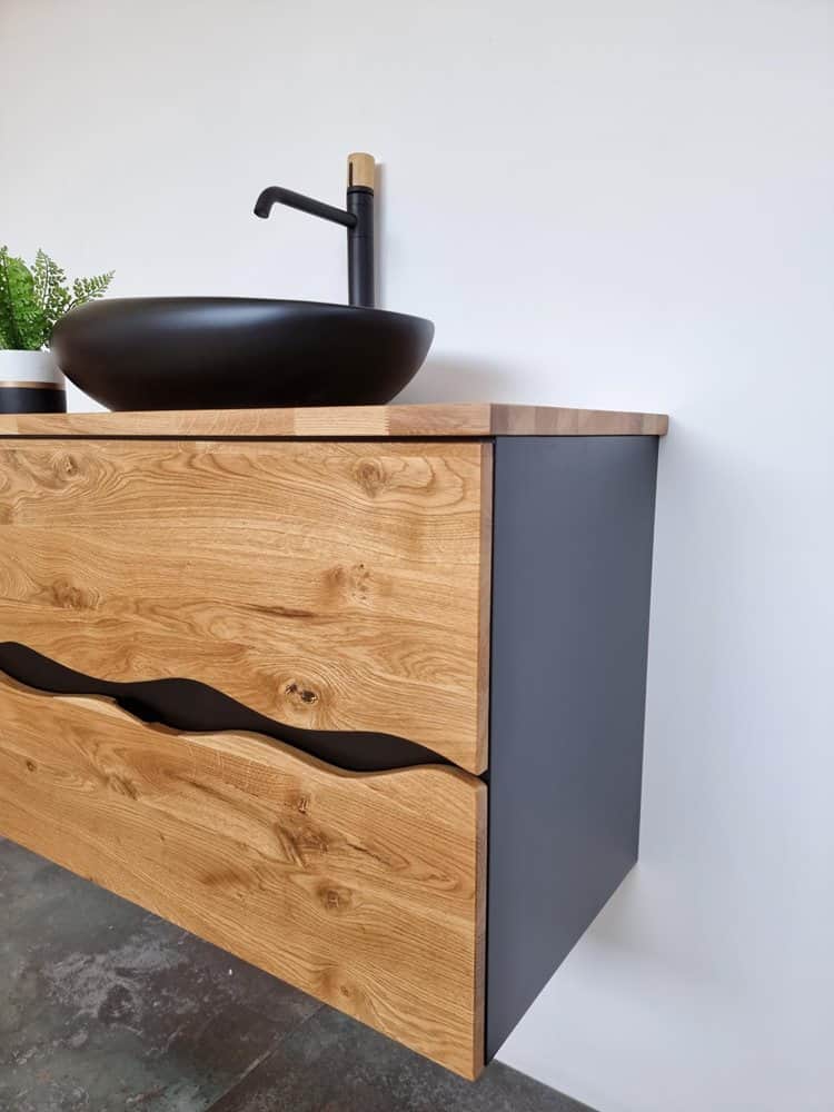 ארון אמבטיה תלוי רוחב 100 ס"מ בעומק 46 ס"מ עשוי מעץ מלא אלון מבוקע עם משטח להנחת כיור מונח דגם גלי 100