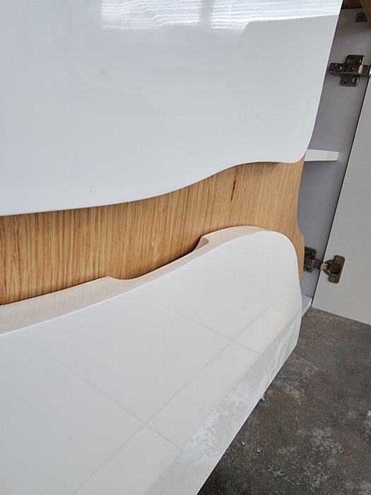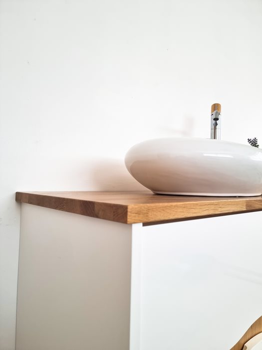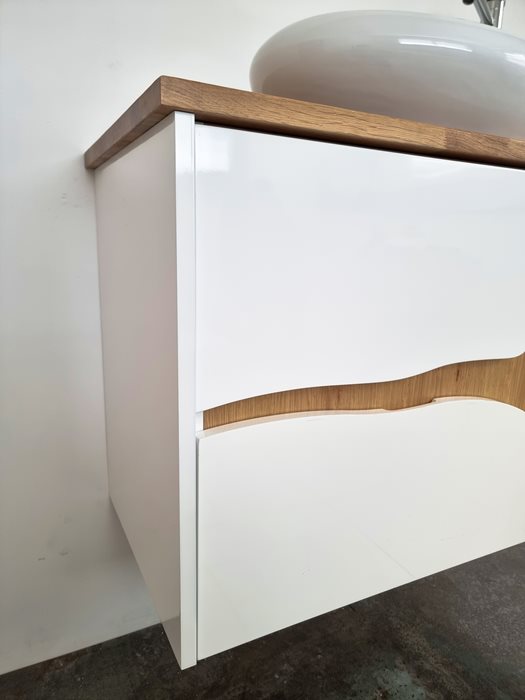 ארון אמבטיה תלוי רוחב 100 ס"מ בעומק 46 ס"מ צבע לבן מבריק עם משטח עץ מלא להנחת כיור מונח וכולל ארון שירות גובה 120 ס"מ דגם גאנא 100