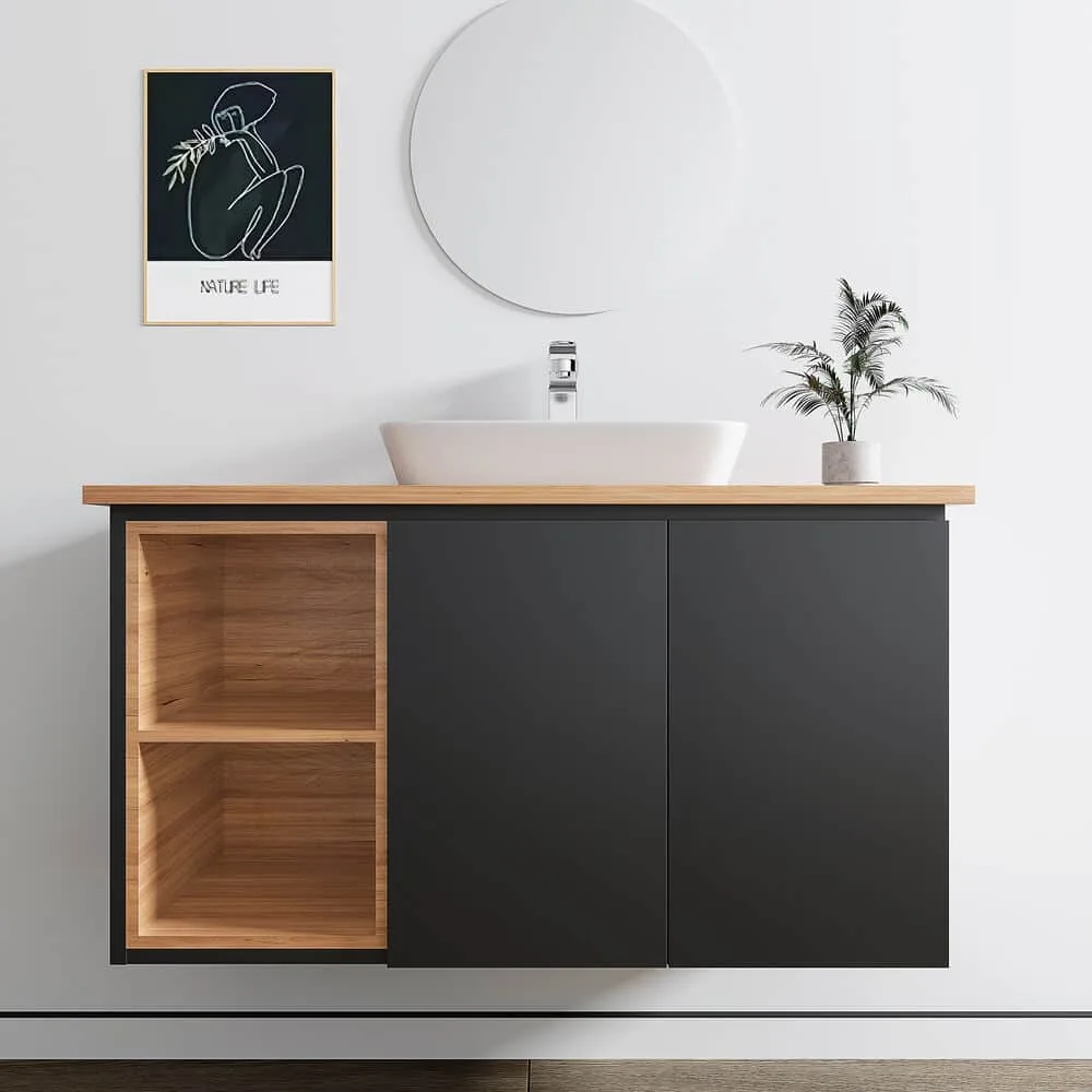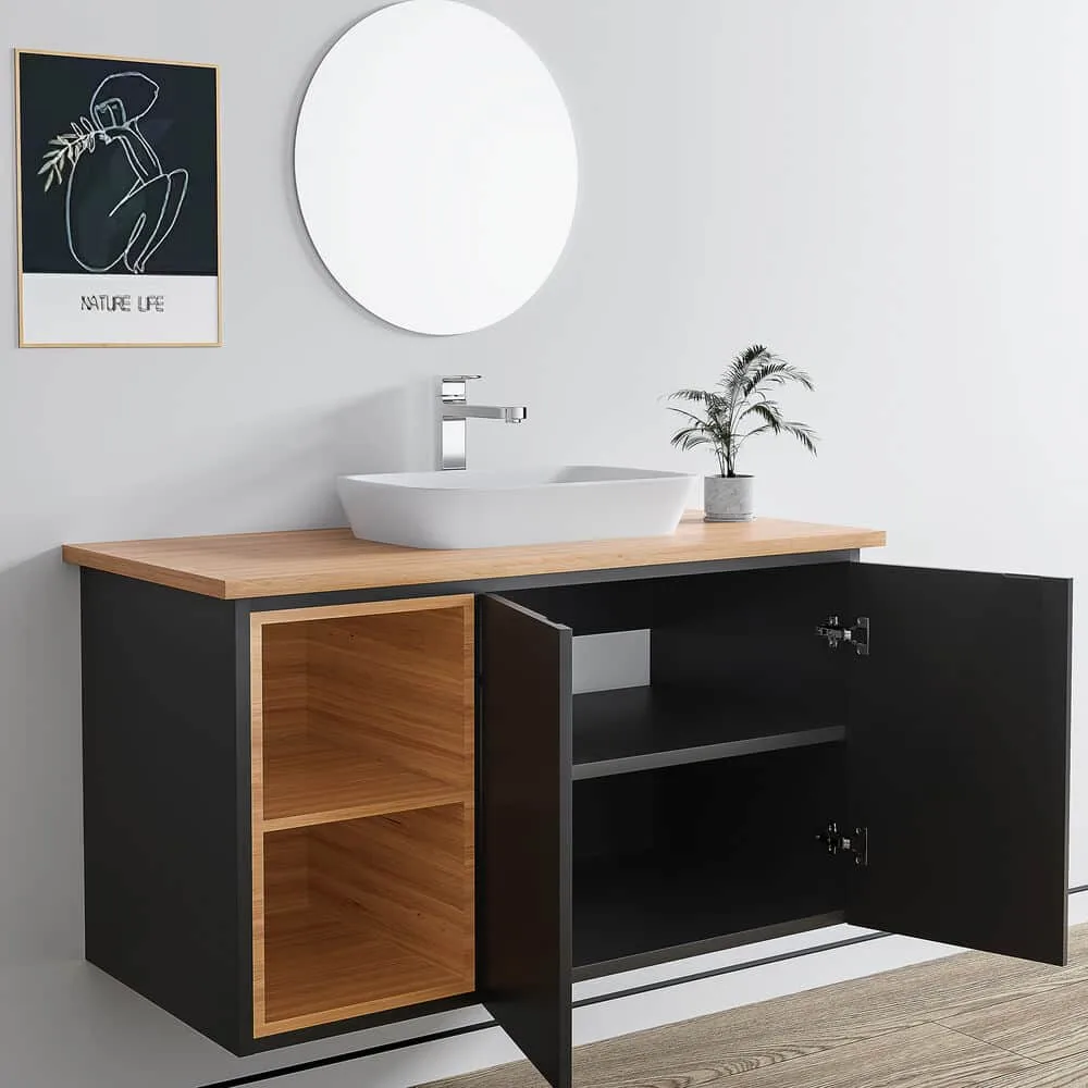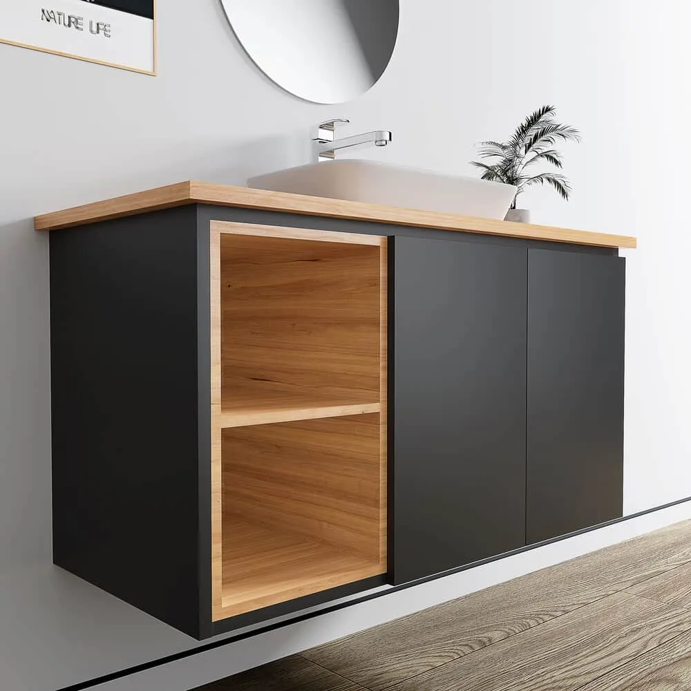 ארון אמבטיה תלוי רוחב 100 ס"מ בעומק 46 ס"מ צבע שחור מט עם משטח עץ מלא להנחת כיור מונח דגם הבאנא 100