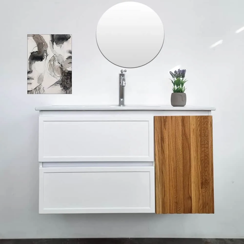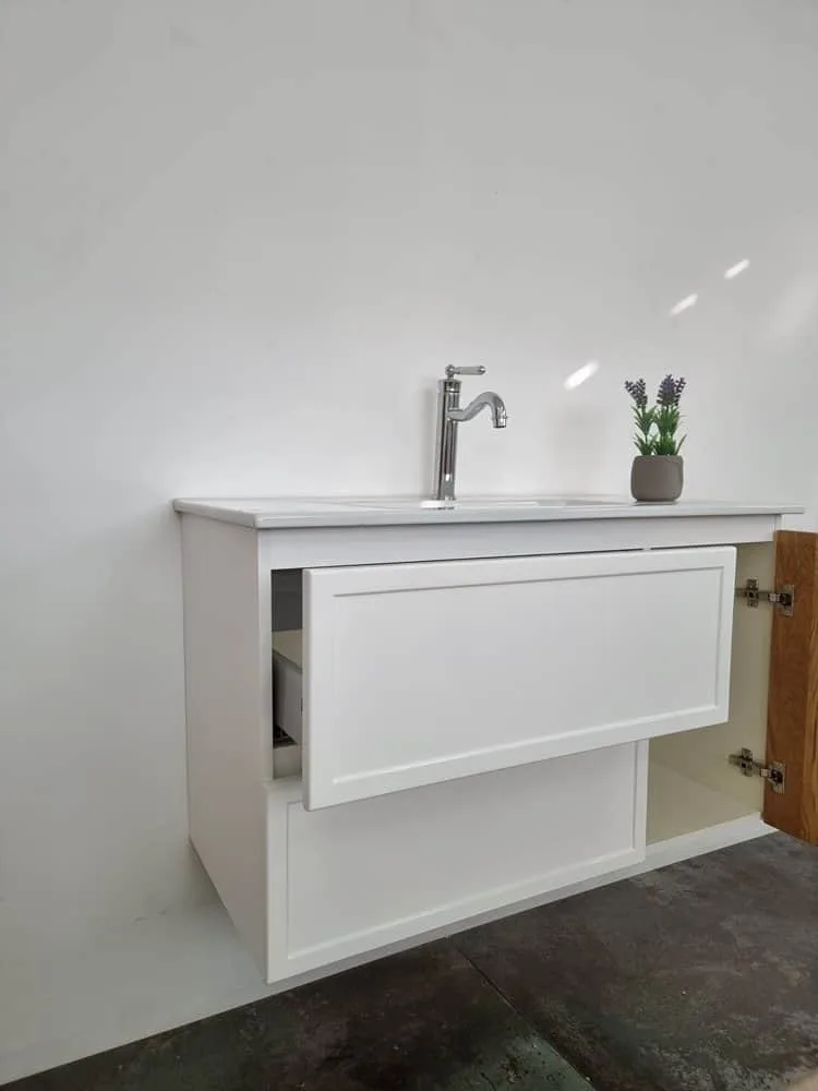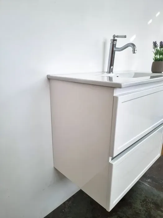 ארון אמבטיה תלוי רוחב 100 ס"מ בעומק 46 ס"מ צבע לבן מבריק עם כיור משטח חרס שקוע דגם קפלוניה 100