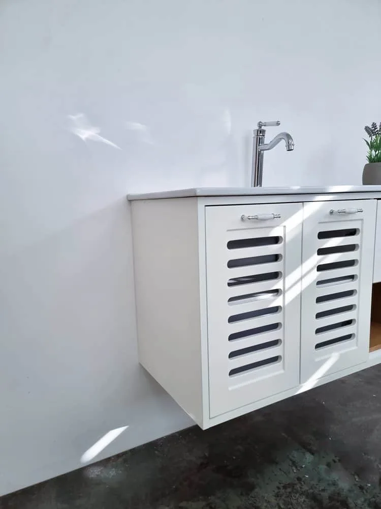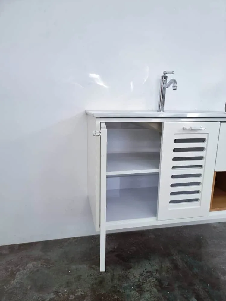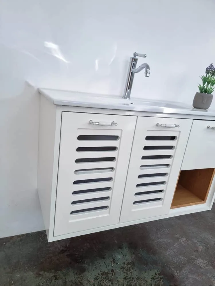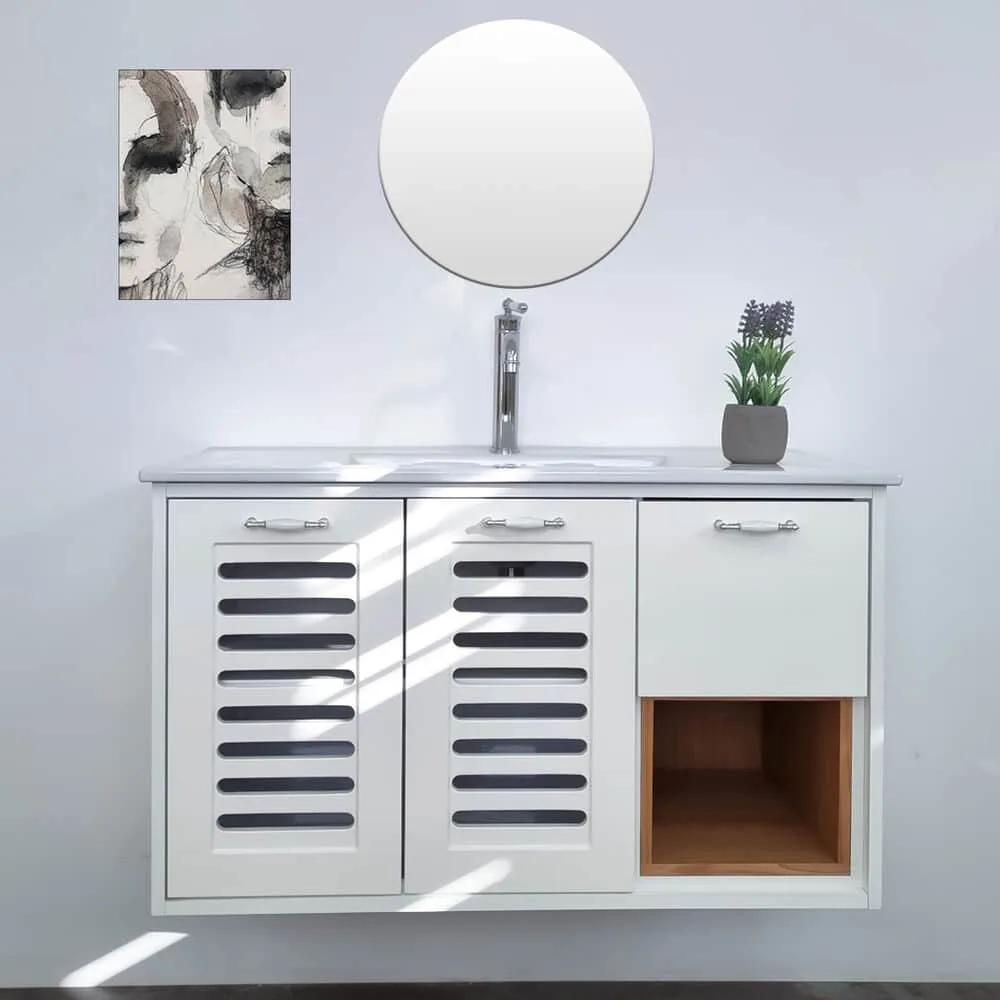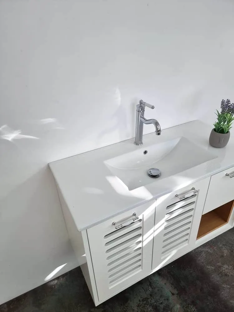 ארון אמבטיה תלוי רוחב 100 ס"מ בעומק 46 ס"מ צבע לבן מבריק עם כיור משטח חרס שקוע דגם פרח 100