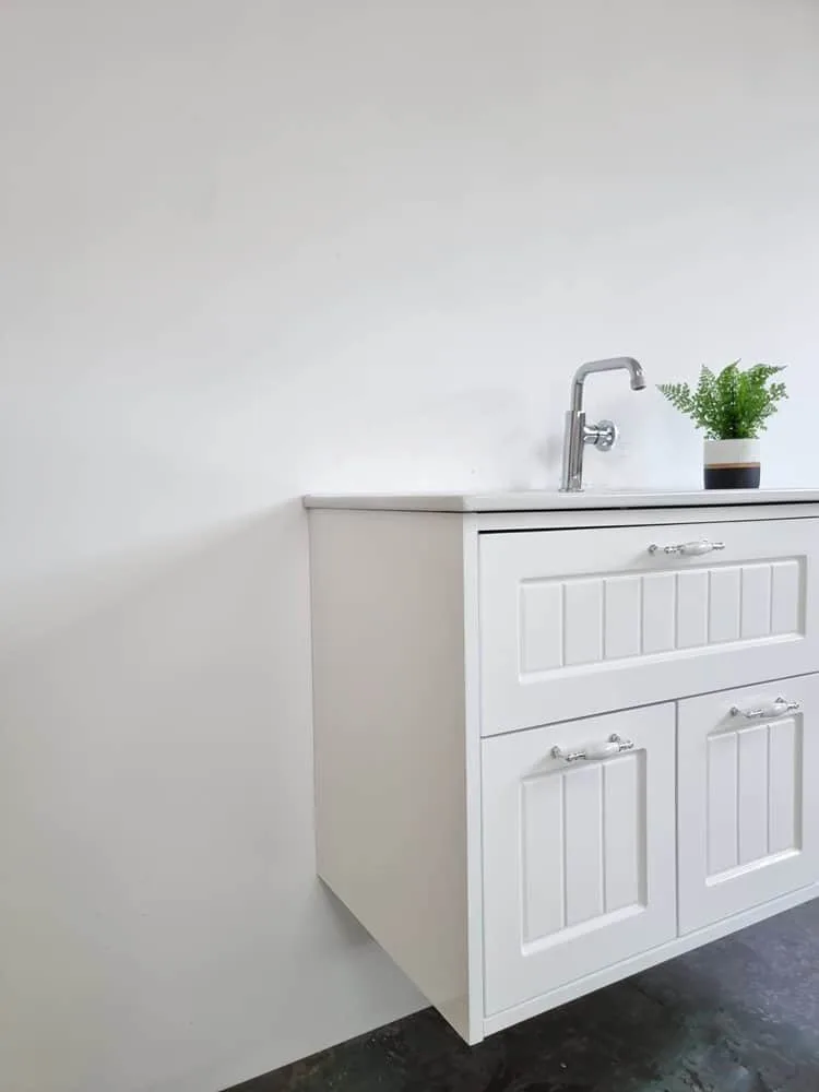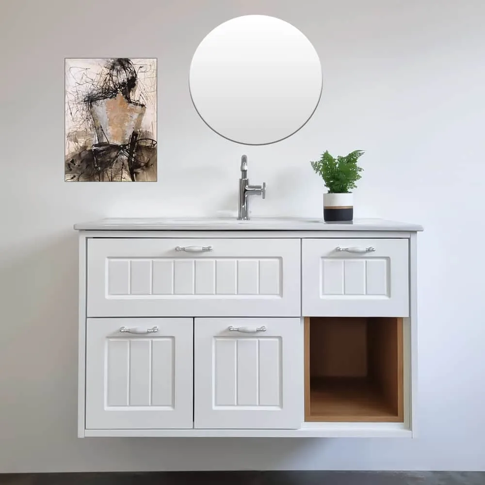 ארון אמבטיה תלוי רוחב 100 ס"מ בעומק 46 ס"מ צבע לבן מבריק עם כיור משטח חרס שקוע דגם ויקטוריה 100