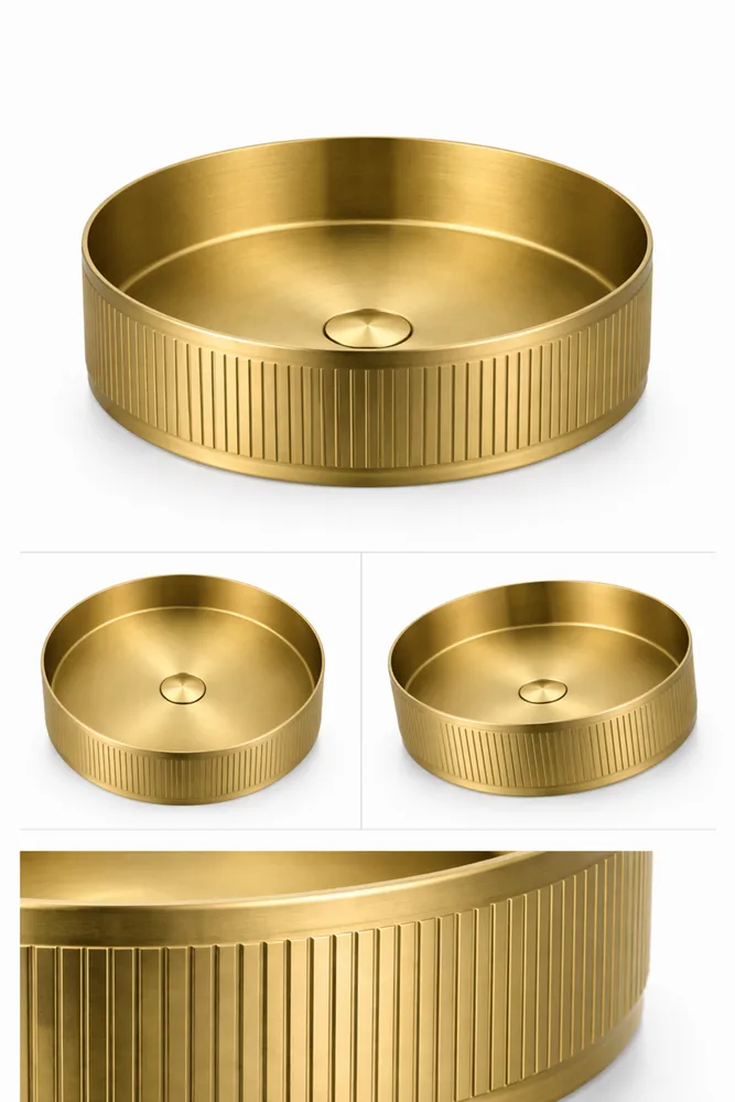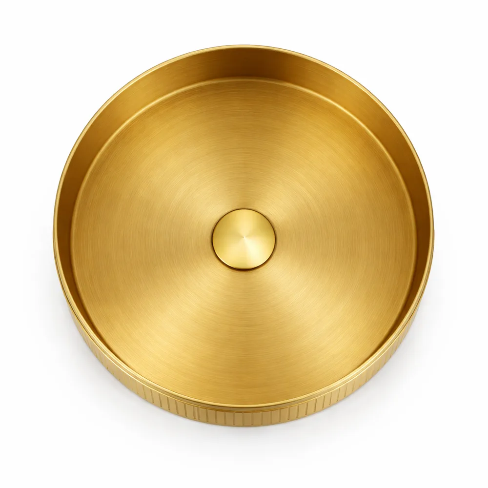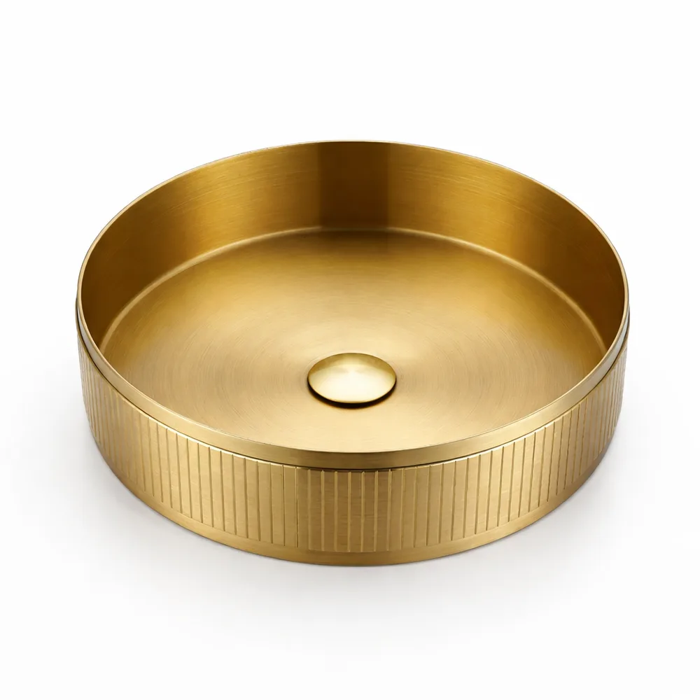 כיור רחצה מונח מעוגל בעיצוב פסים עשוי מנירוסטה קוטר 36 ס"מ צבע זהב מט PVD דגם GS-5543
