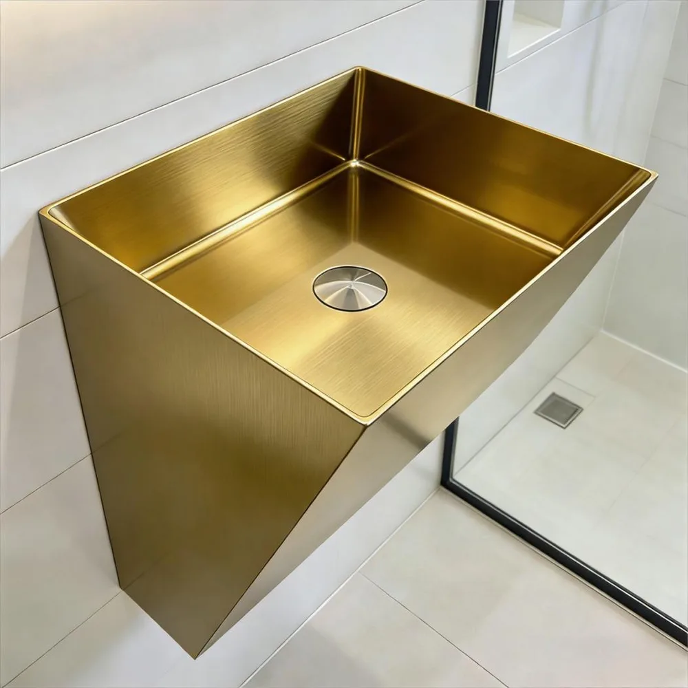 כיור רחצה מלבני תלוי עשוי מנירוסטה רוחב 40 ס"מ ועומק 31 ס"מ צבע זהב מט PVD בלי חור לברז דגם G-4352