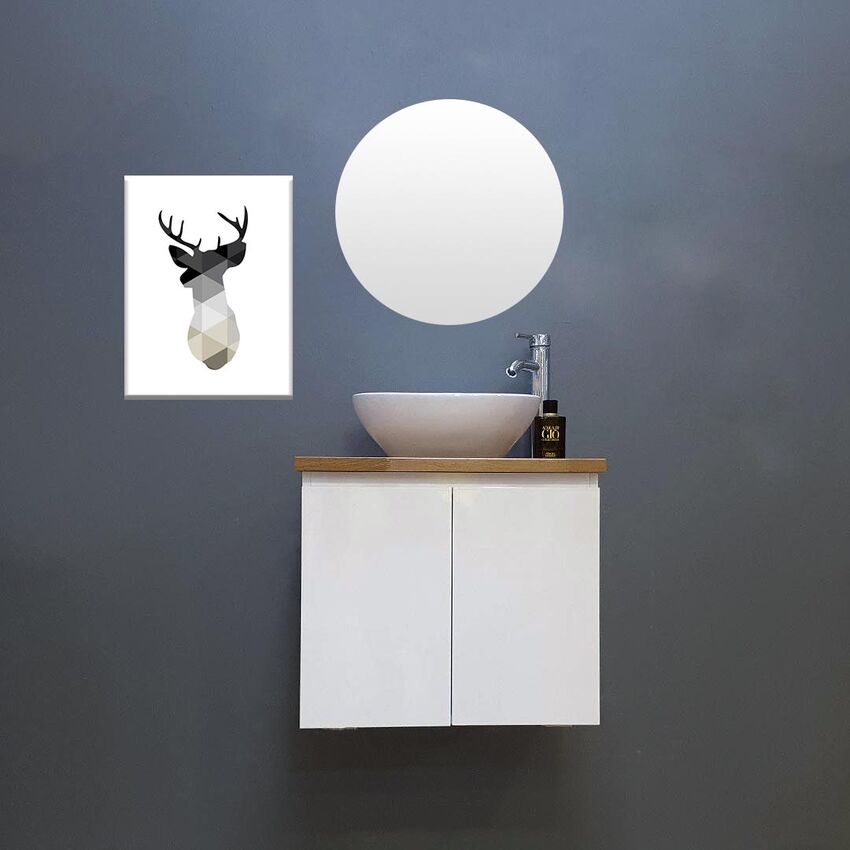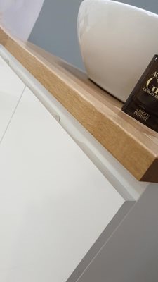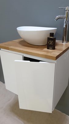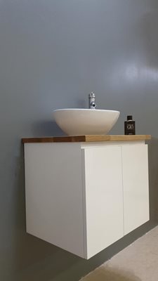 ארון אמבטיה תלוי רוחב 47 ס"מ בעומק 24 ס"מ צבע לבן מבריק עם משטח עץ מלא להנחת כיור מונח דגם גל 47