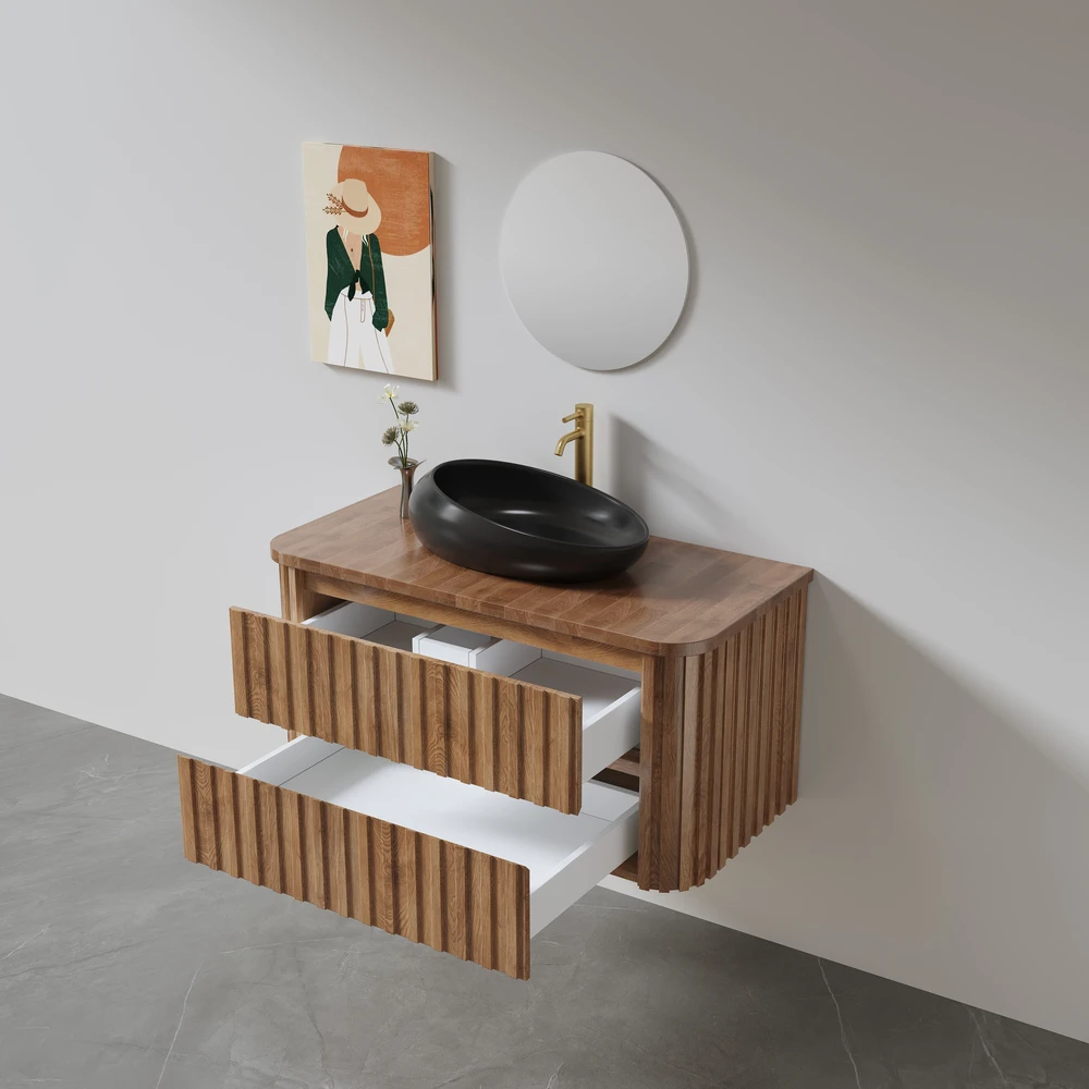 ארון אמבטיה תלוי לפי מידה רוחב ועומק לפי בחירתך עשוי מעץ מלא אלון מבוקע עם משטח להנחת כיור מונח דגם בורגי W