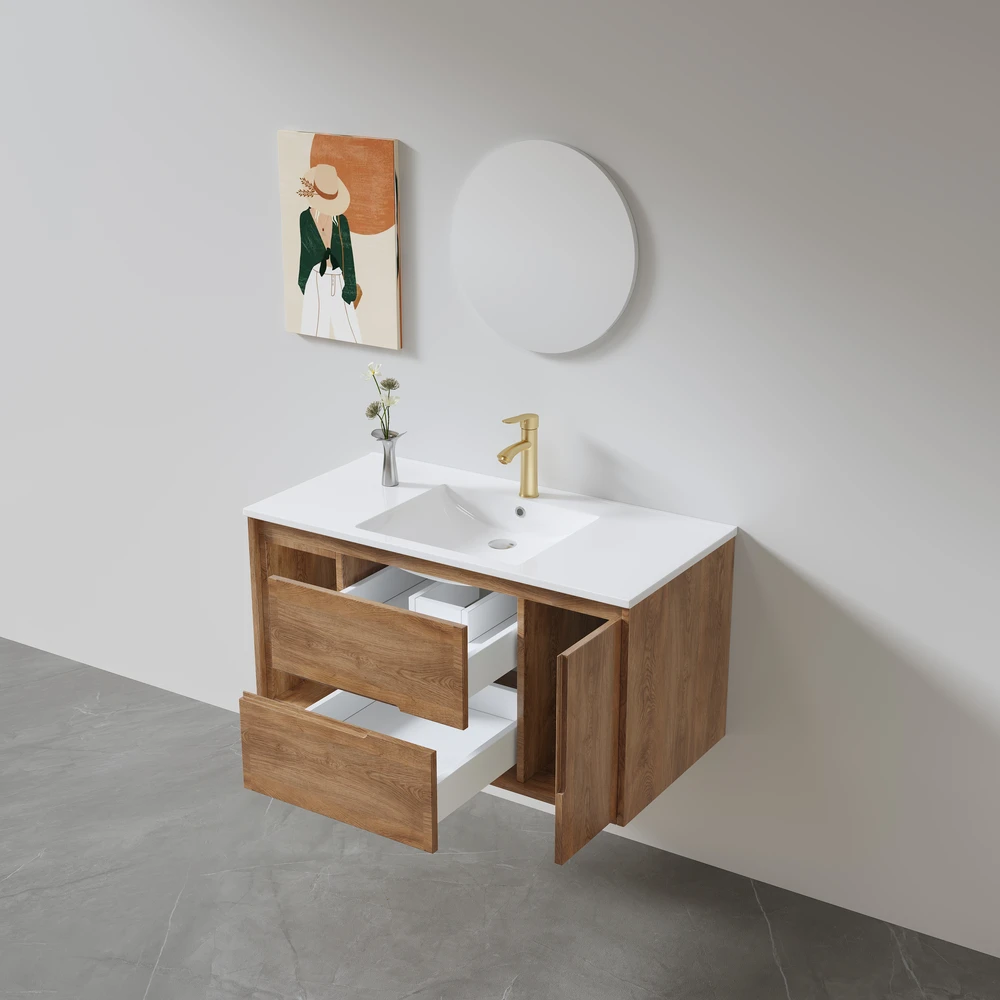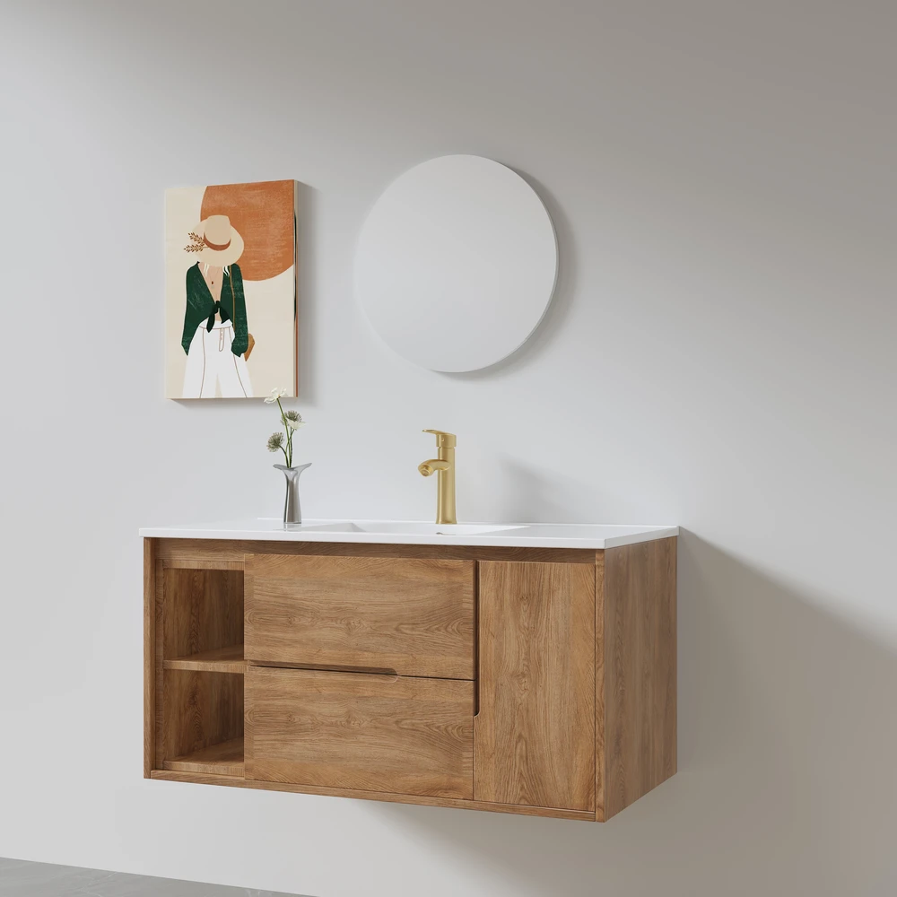 ארון אמבטיה תלוי לפי מידה רוחב ועומק לפי בחירתך עשוי מעץ מלא אלון מבוקע עם כיור משטח חרס שקוע דגם רוליק W