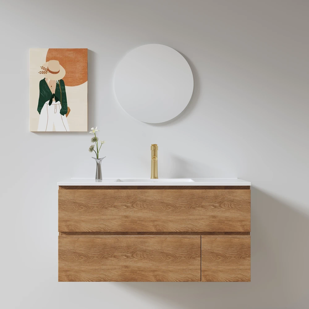ארון אמבטיה תלוי רוחב 80, 100 ס"מ לבחירתך בעומק 46 ס"מ עשוי מעץ מלא אלון מבוקע עם כיור משטח חרס שקוע דגם קורפו
