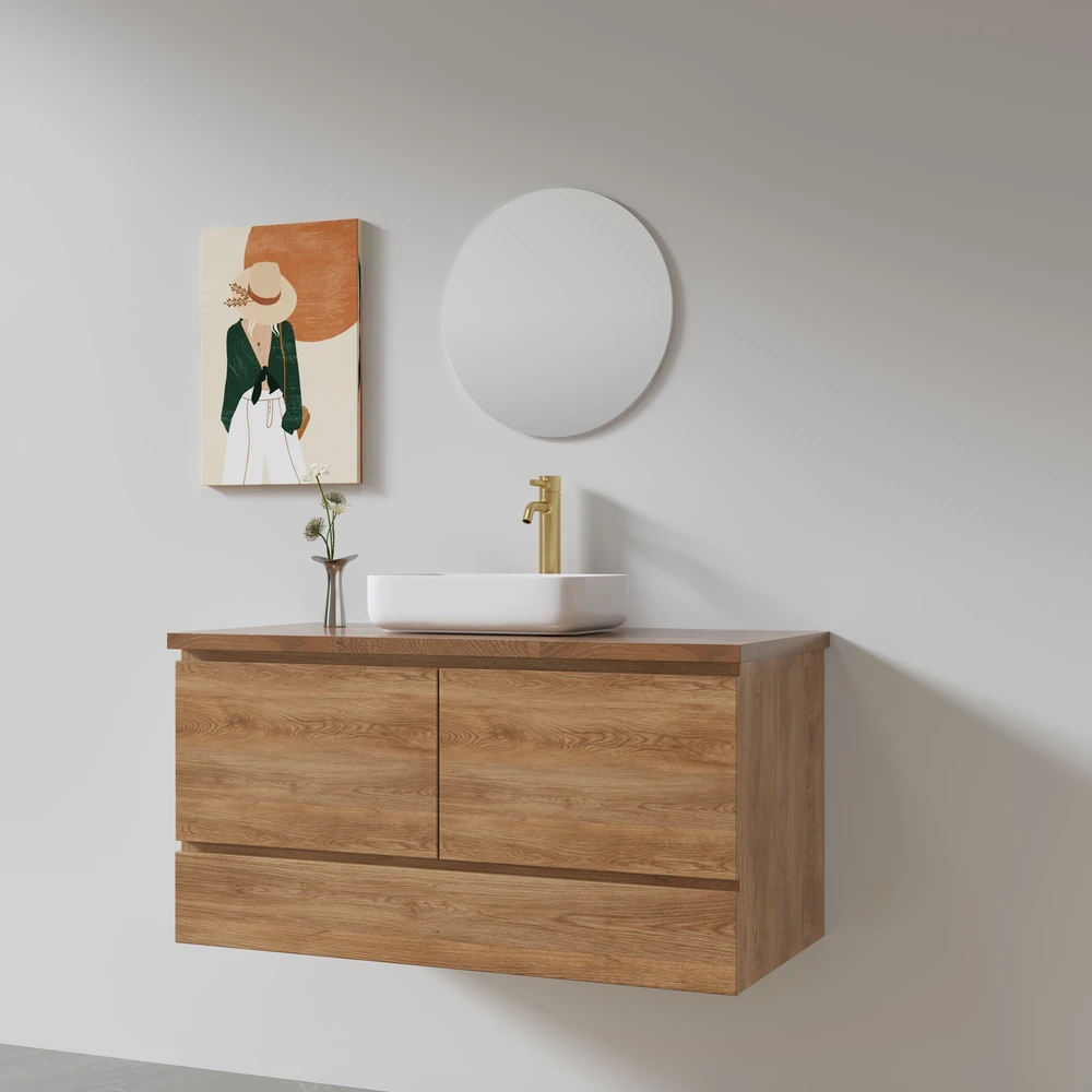 ארון אמבטיה תלוי לפי מידה רוחב ועומק לפי בחירתך עשוי מעץ מלא אלון מבוקע עם משטח להנחת כיור מונח דגם פאקסי W