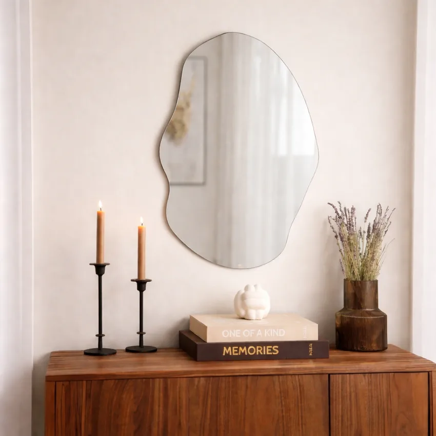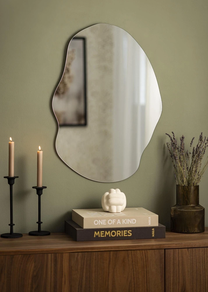 מראה מרחפת לתליה בצורה אמורפית ללא מסגרת רוחב 70 ס"מ גובה 90 ס"מ דגם M-762