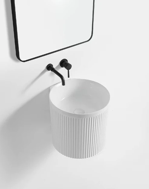כיור רחצה מעוגל מחורץ תלוי קוטר 40 ס"מ צבע לבן מבריק בלי חור לברז דגם לימניס