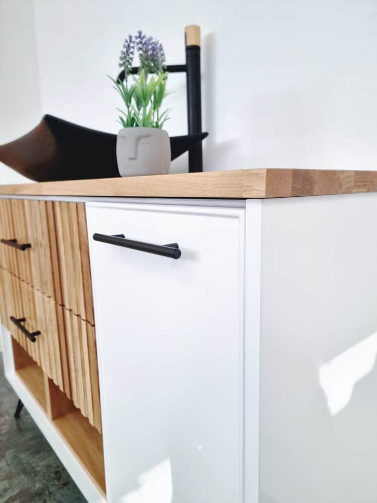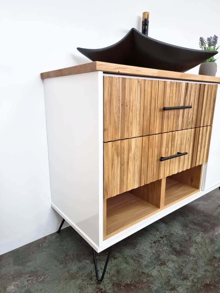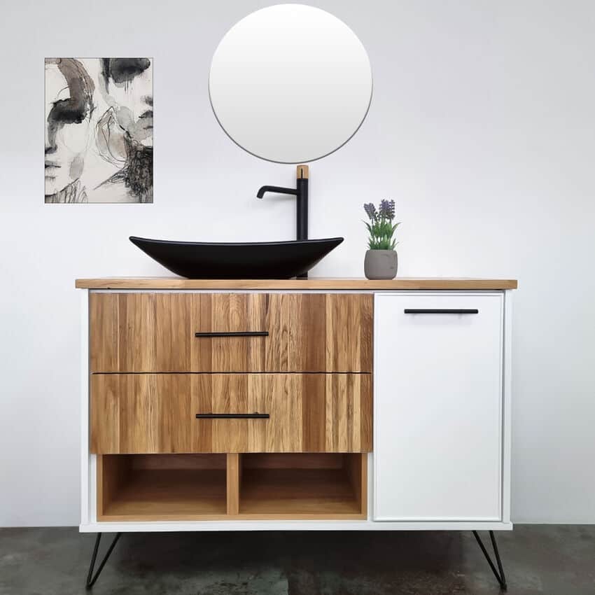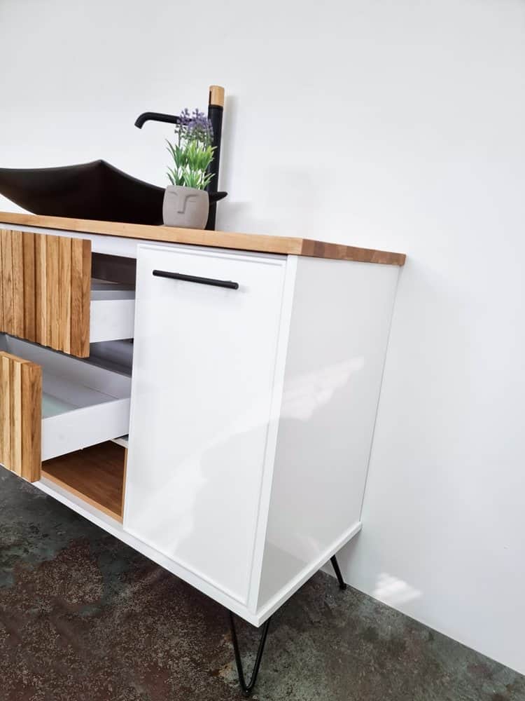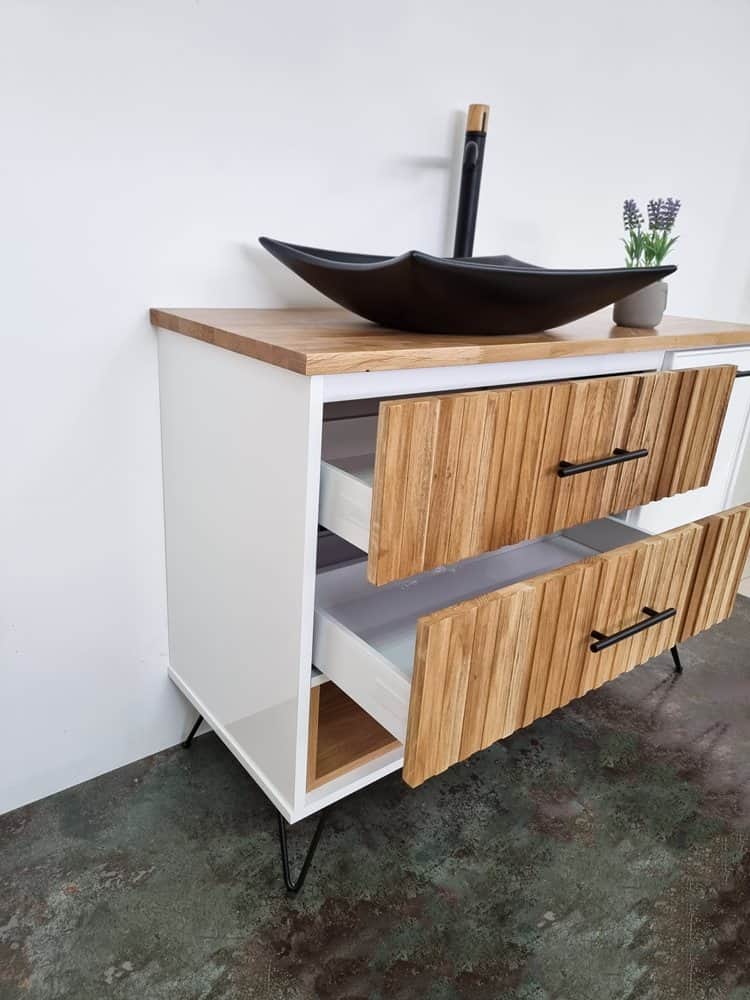 ארון אמבטיה עומד רוחב 120 ס"מ בעומק 46 ס"מ צבע לבן מט עם משטח עץ מלא להנחת כיור מונח דגם טורנטו 120
