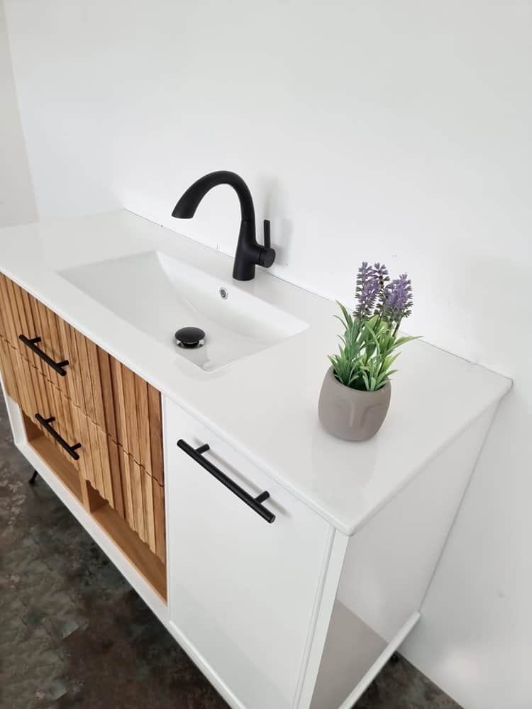 ארון אמבטיה עומד רוחב 120 ס"מ בעומק 46 ס"מ צבע לבן מט עם כיור משטח חרס שקוע דגם בנגקוק 120
