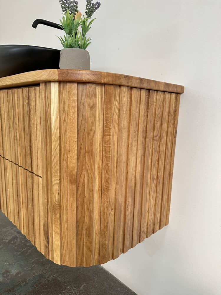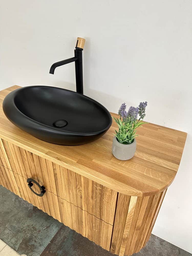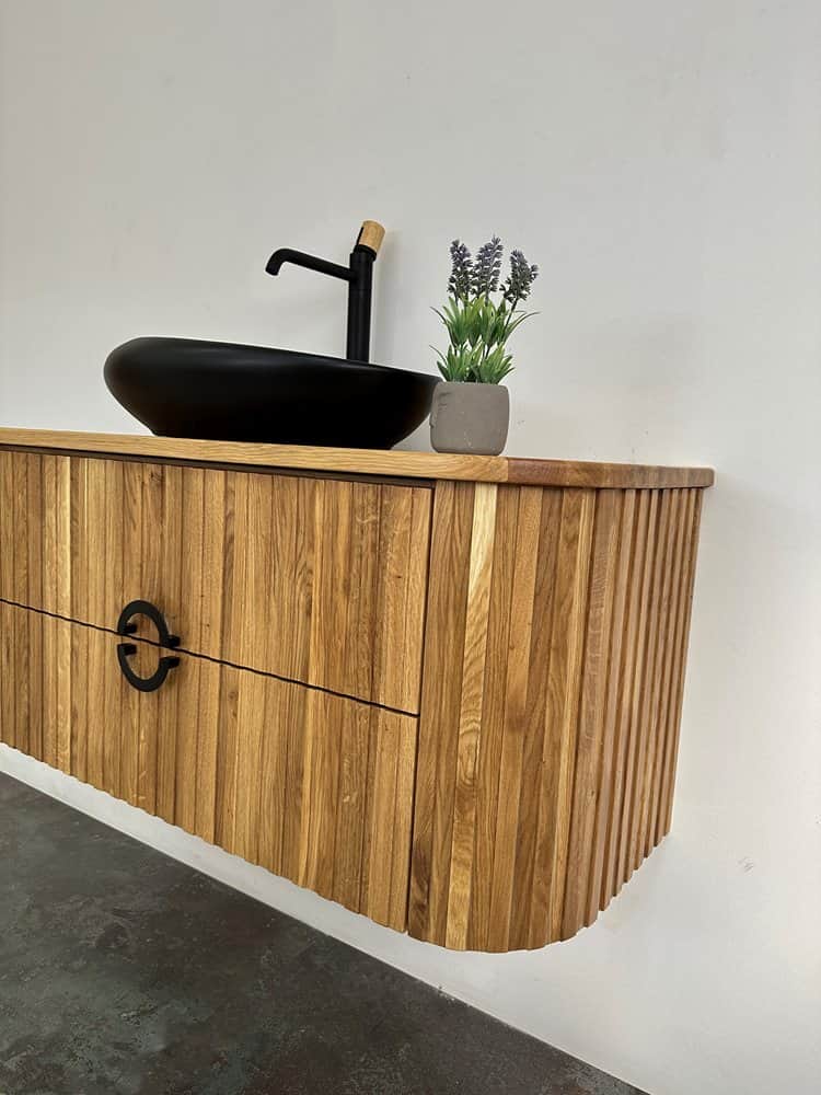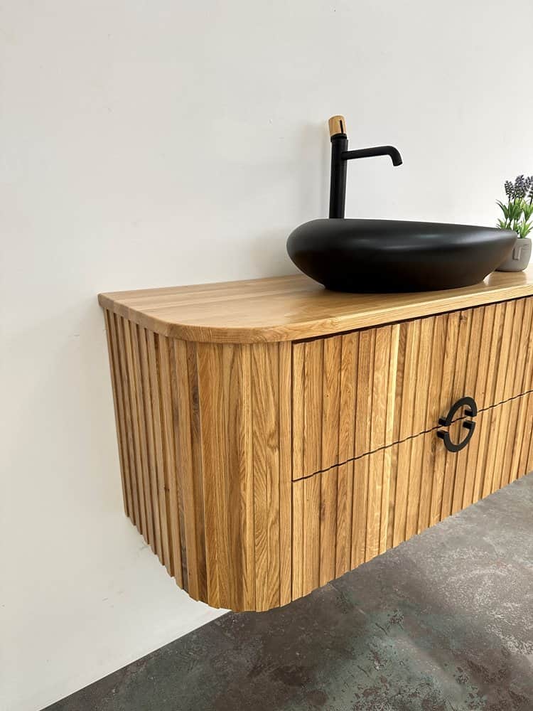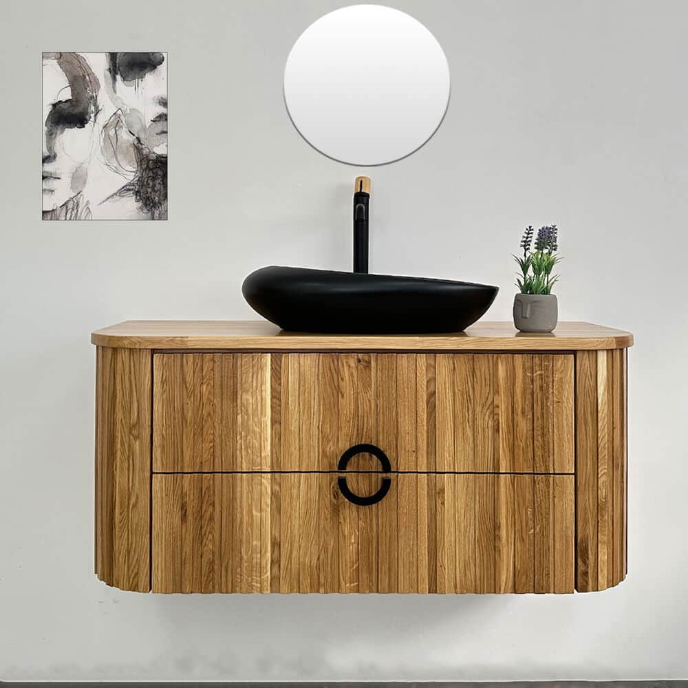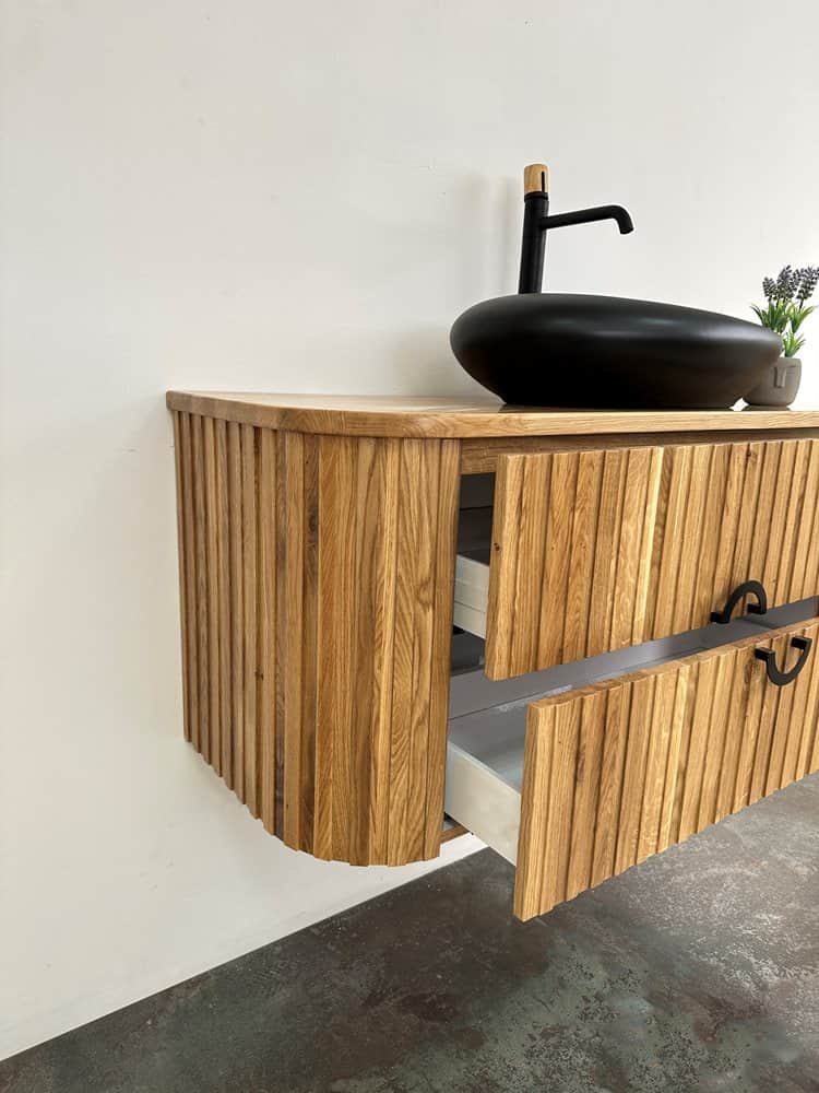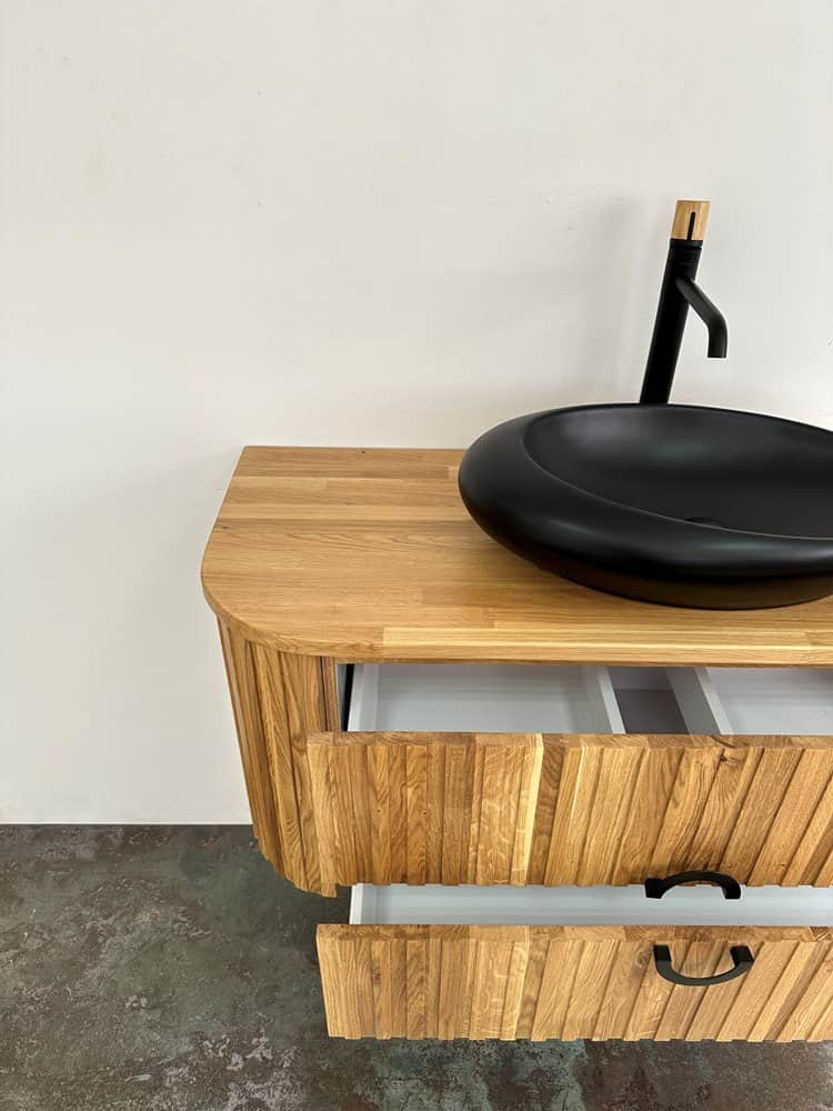 ארון אמבטיה תלוי רוחב 120 ס"מ בעומק 46 ס"מ עשוי מעץ מלא אלון מבוקע עם משטח להנחת כיור מונח דגם בורגוז 120