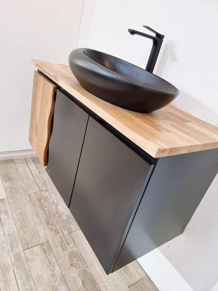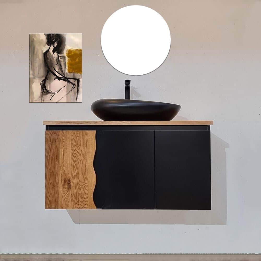 ארון אמבטיה תלוי רוחב 100 ס"מ בעומק 46 ס"מ צבע שחור מט עם משטח עץ מלא להנחת כיור מונח דגם מיאמי 100