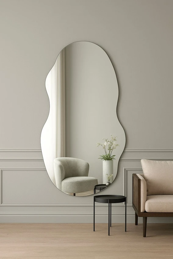 מראת גוף מרחפת בצורה אמורפית לתליה ללא מסגרת רוחב 100 ס"מ גובה 180 ס"מ דגם LM-21